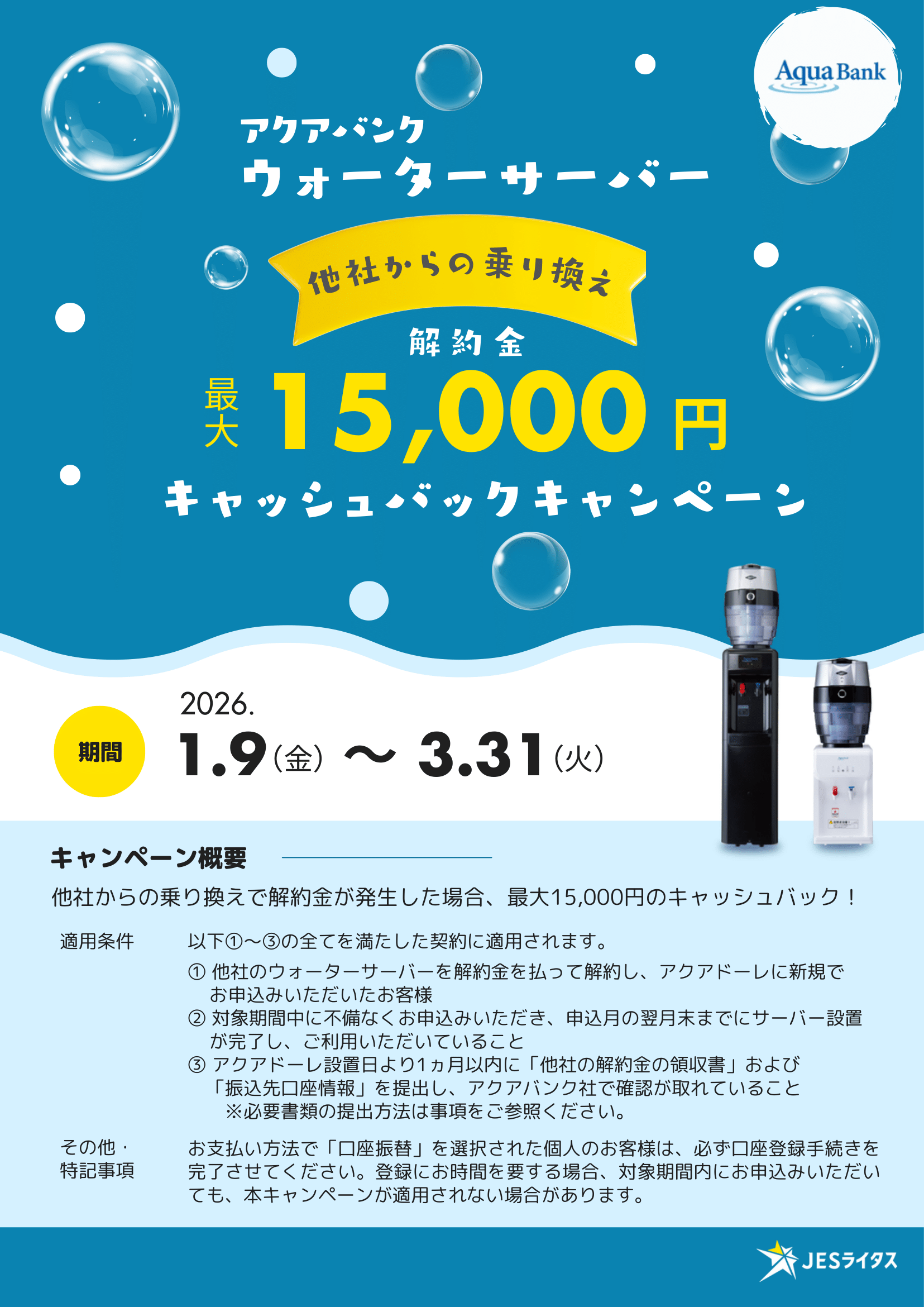 📅 2026年1月9日㈮~3月31日㈫まで 💰 他社解約金 最大15,000円キャッシュバック! ✨ 他社ウォーターサーバーからの乗り換えでお得にスタート! 🔥 今がチャンス!この機会をお見逃しなく! ✅ 条件を満たせば、解約金をしっかりサポートします。 👉 詳しくはフライヤーをチェック!