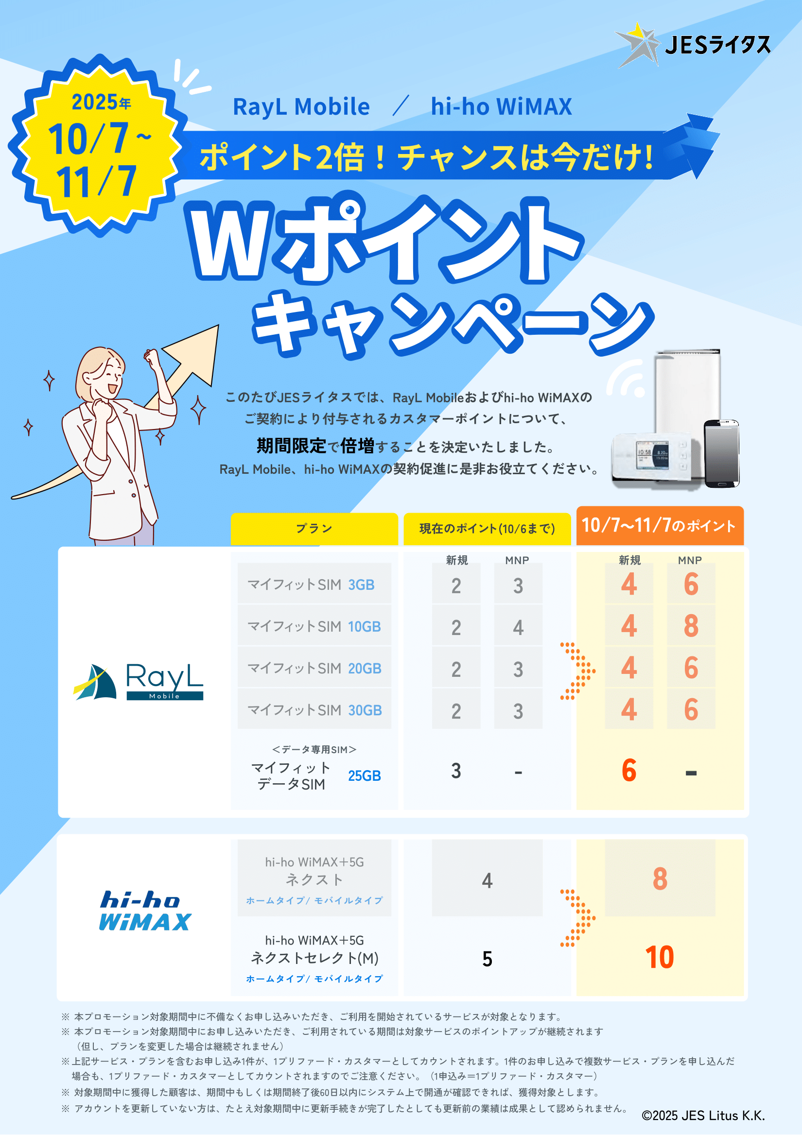 期間中、RayL Mobileおよびhi-ho WiMAXの対象プランでお申し込みいただくと、獲得ポイントが通常の2倍に!