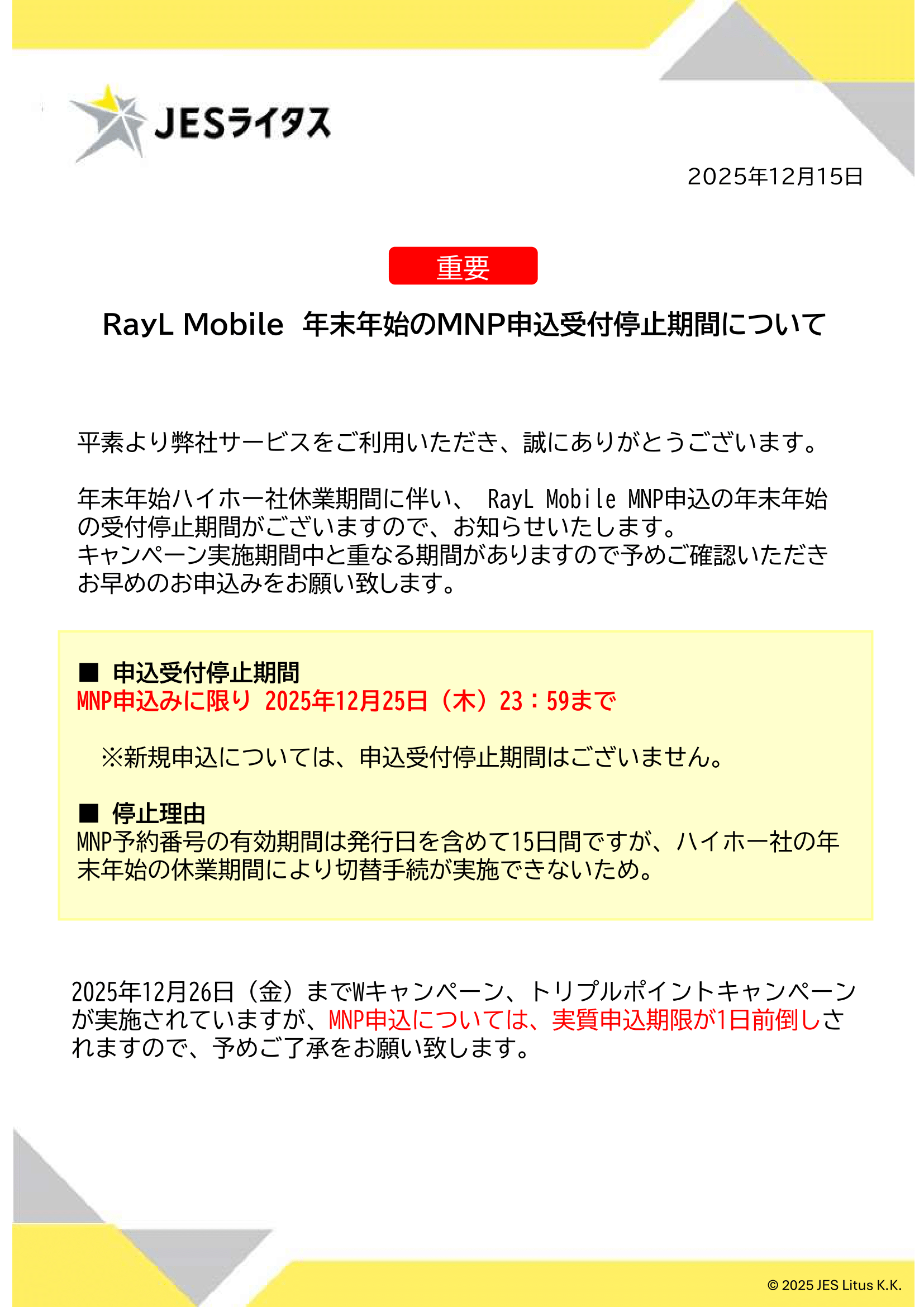 RayL Mobile 年末年始のMNP申込受付停止期間について