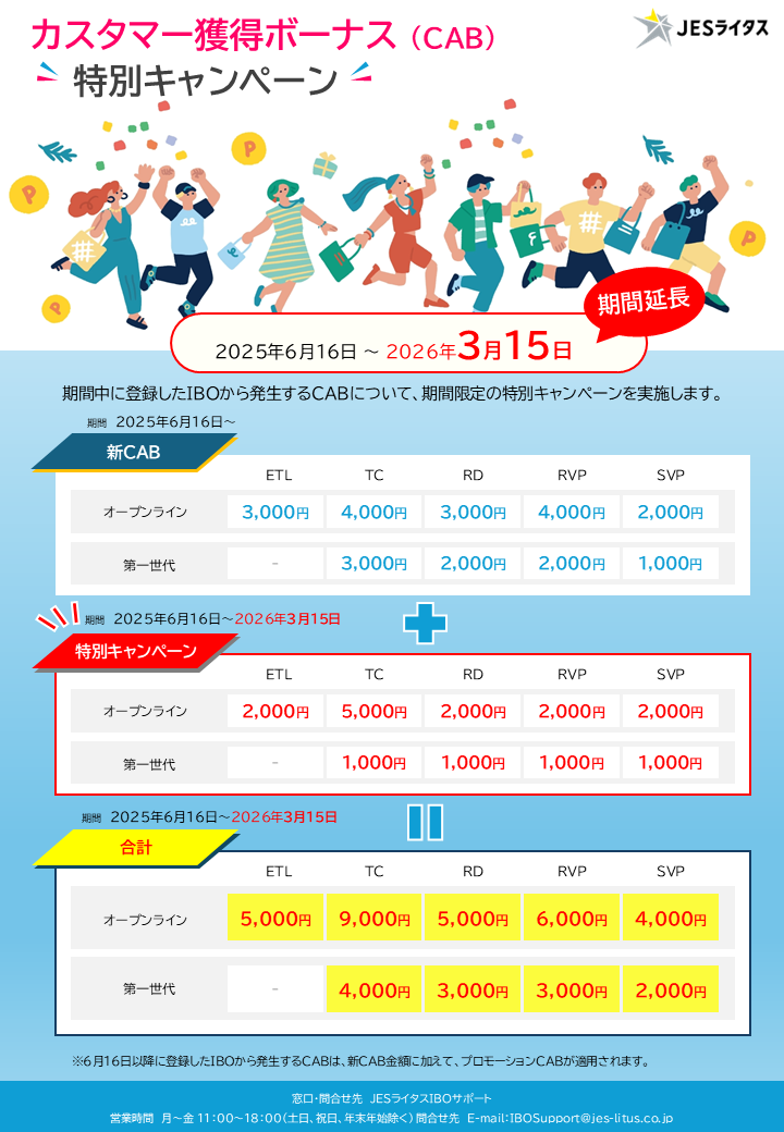 新しく登録されたIBOから発生するCABについて、通常の新CABに加え、特別キャンペーンCABが上乗せされます!🔥