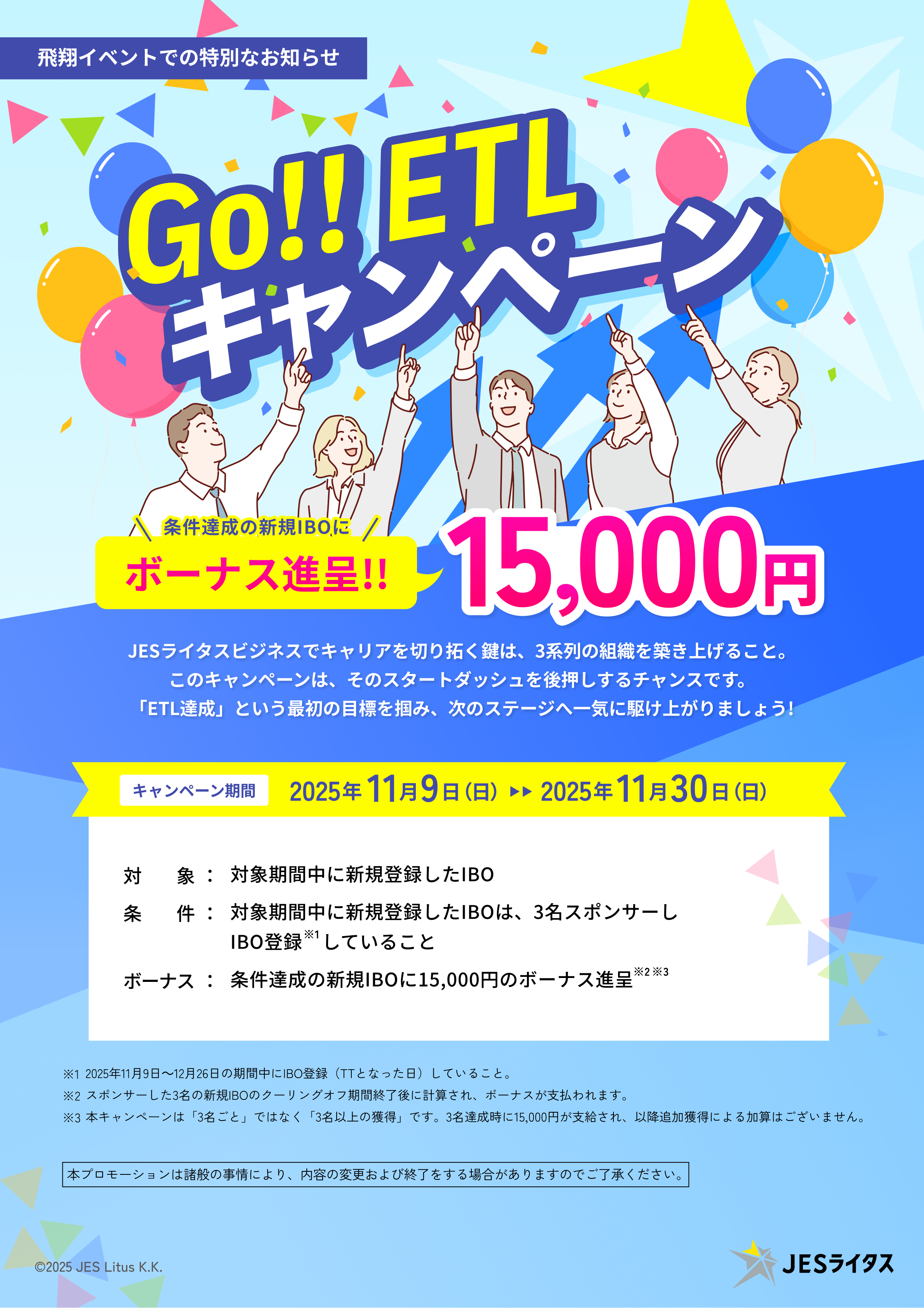 JESライタスでは、2025年11月9日(日)に開催された「飛翔イベント」にて、**新規IBO登録者向けの特別プロモーション『Go!! ETLキャンペーン』**を発表いたしました!